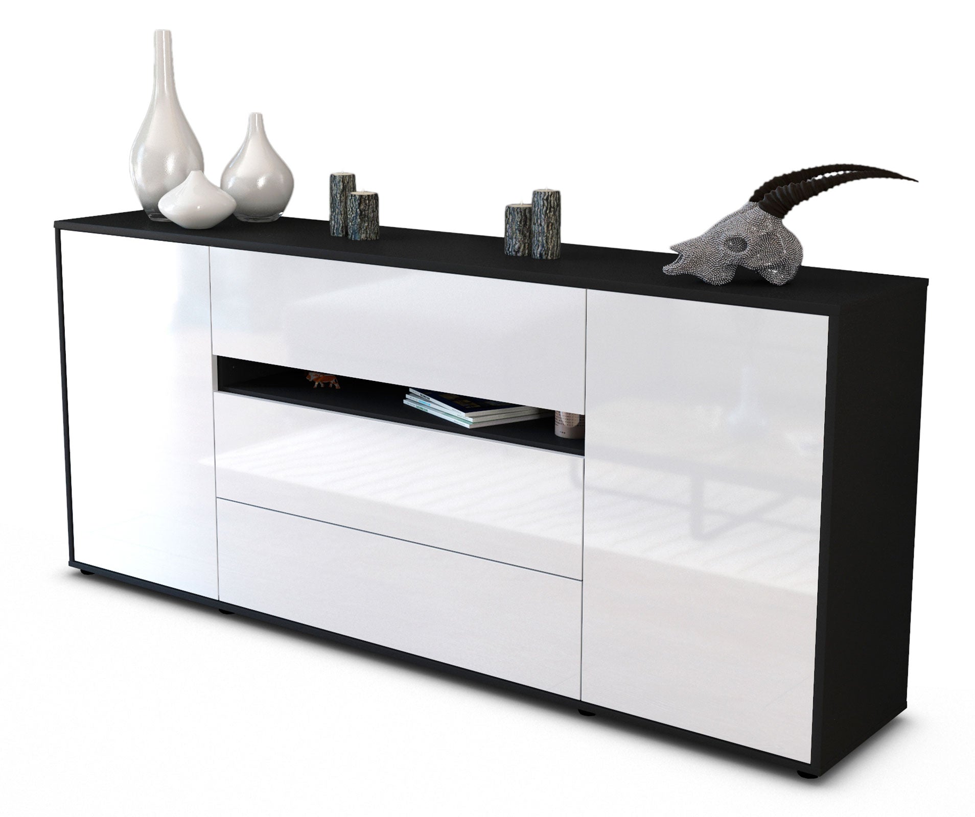 Dieses Sideboard hat Gesamt-Maße von 180x79x35cm. Viel Platz, eine leere Wand, kein passendes Möbelstück? Unsere 1,80 m lange Kommode ist die perfekte Lösung! Die Frontfarbe Hochglanz Weiß bringt als reine und unschuldige Farbe Ruhe in jeden Raum. Mit dem Glanz Weiss erzeugt man einen hochwertigen glänzenden Kontrast zu dunklen Wänden. Der anthrazit-matte Korpus harmoniert mit allen Farben und wirkt besonders edel im Kontrast zu hellen Wänden.