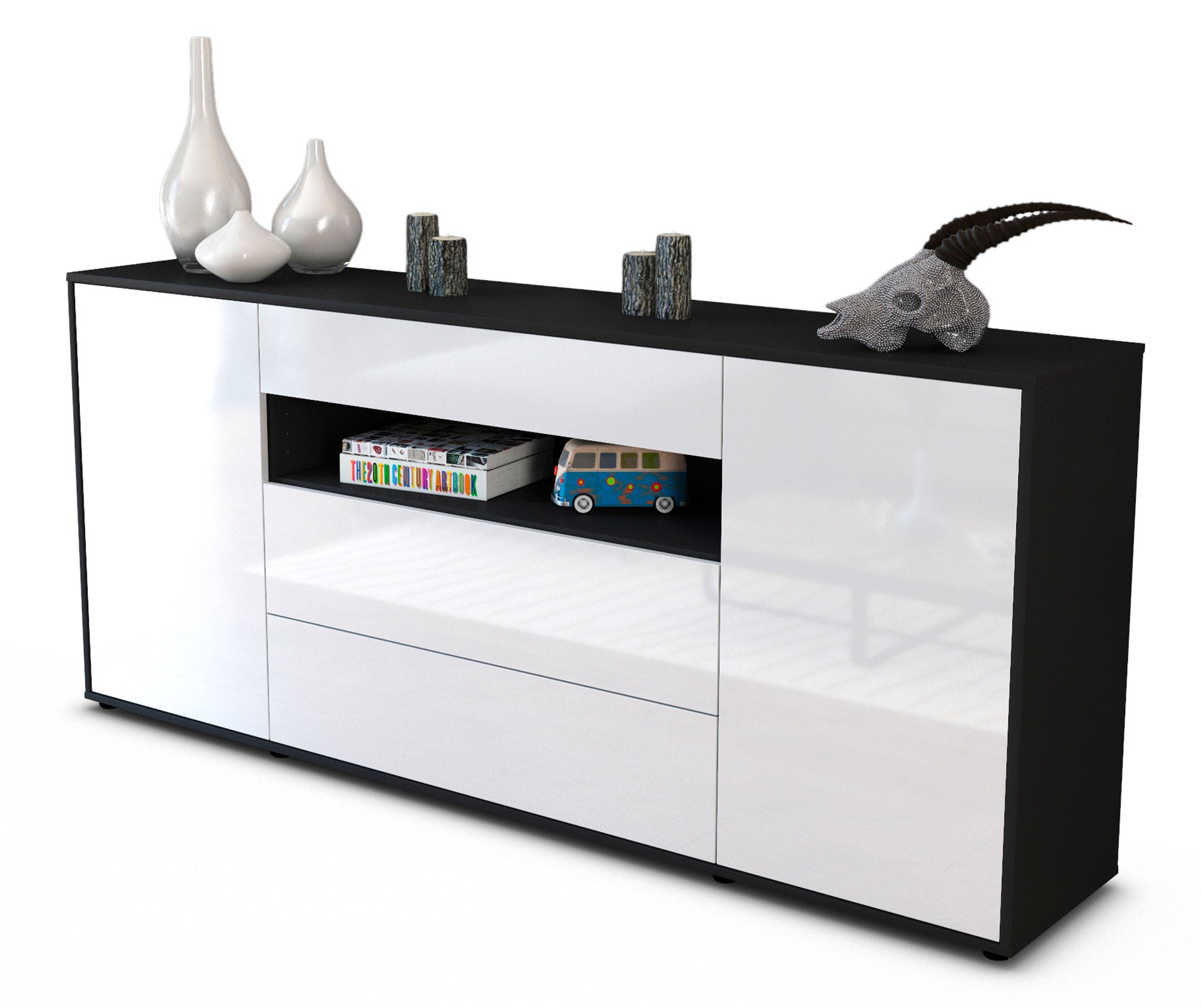 Dieses Sideboard hat Gesamt-Maße von 180x79x35cm. Viel Platz, eine leere Wand, kein passendes Möbelstück? Unsere 1,80 m lange Kommode ist die perfekte Lösung! Die Frontfarbe Hochglanz Weiß bringt als reine und unschuldige Farbe Ruhe in jeden Raum. Mit dem Glanz Weiss erzeugt man einen hochwertigen glänzenden Kontrast zu dunklen Wänden. Der anthrazit-matte Korpus harmoniert mit allen Farben und wirkt besonders edel im Kontrast zu hellen Wänden.