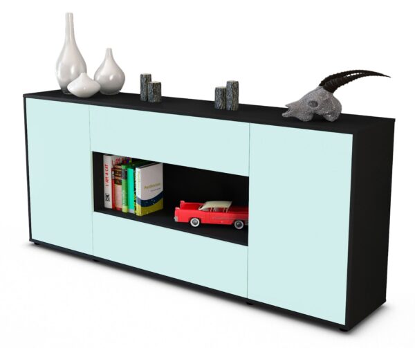 Dieses Sideboard hat Gesamt-Maße von 180x79x35cm. Viel Platz, eine leere Wand, kein passendes Möbelstück? Unsere 1,80 m lange Kommode ist die perfekte Lösung! Die Frontfarbe Eisblau verleiht Ihrem Raum Frische. Das Himmelblau fördert eine sanfte Atmosphäre. Die Farben Hellblau und Mint werden gerne für moderne Wohnräume verwendet. Der anthrazit-matte Korpus harmoniert mit allen Farben und wirkt besonders edel im Kontrast zu hellen Wänden.