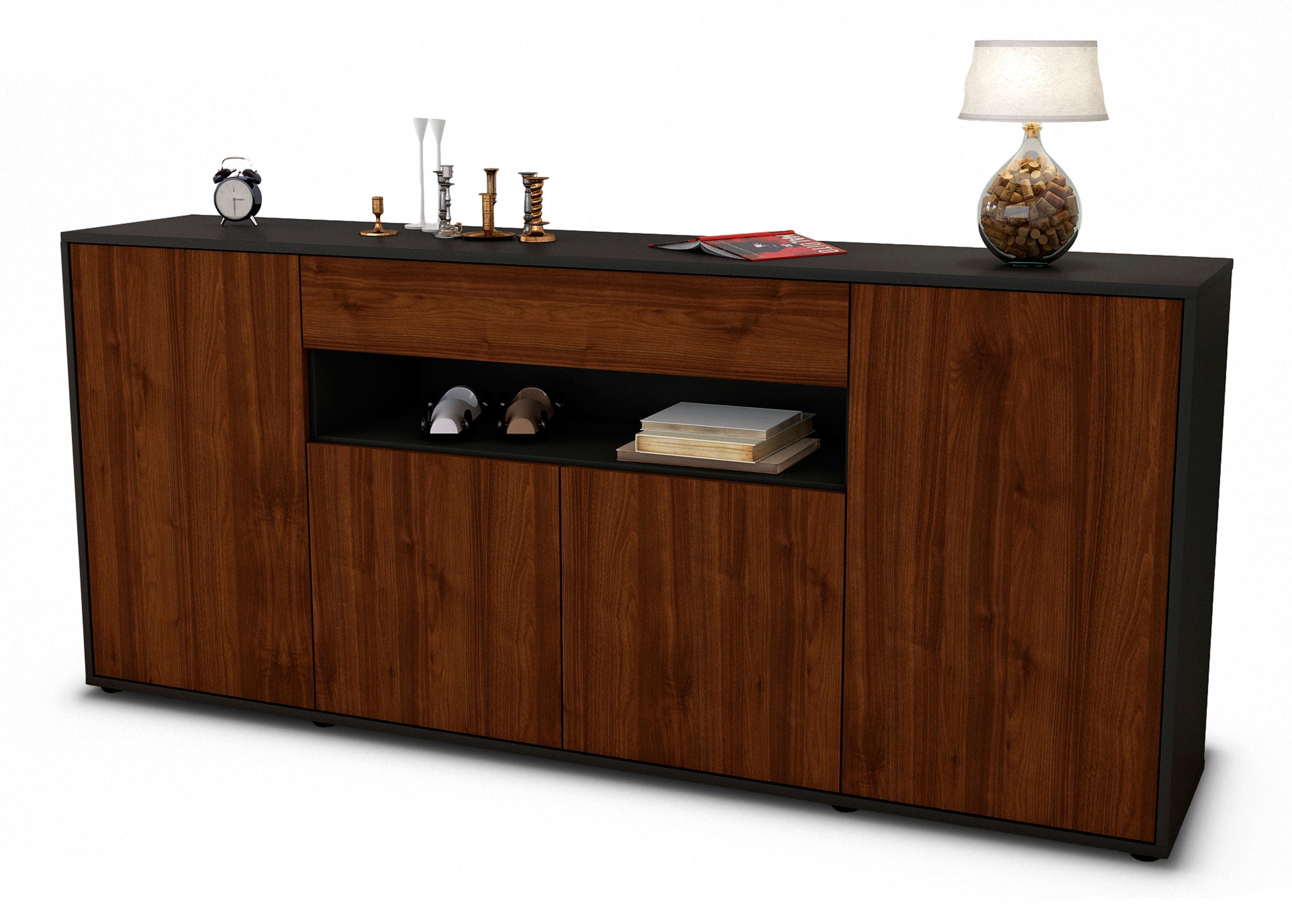 Dieses Sideboard hat Gesamt-Maße von 180x79x35cm. Viel Platz, eine leere Wand, kein passendes Möbelstück? Unsere 1,80 m lange Kommode ist die perfekte Lösung! Die Holz Front Walnuss Nachbildung wirkt mit einem dunklen und intensiven Braun sehr einladend. Das dunkel erscheinende Holz passt sehr gut zu einem gemütlichen Einrichtungsstil. Der anthrazit-matte Korpus harmoniert mit allen Farben und wirkt besonders edel im Kontrast zu hellen Wänden.