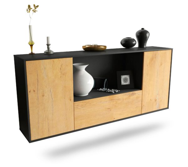 Dieses Sideboard hat Gesamt-Maße von 180x79x35cm. Viel Platz, eine leere Wand, kein passendes Möbelstück? Unsere 1,80 m lange Kommode ist die perfekte Lösung! Die Holz Front Eiche Nachbildung überzeugt mit einem warmen, intensiven Braun sowie einer auffälligen Holzmaserung und sorgt mit seiner gelblichen Holzoptik für eine rustikale Gemütlichkeit. Der anthrazit-matte Korpus harmoniert mit allen Farben und wirkt besonders edel im Kontrast zu hellen Wänden.