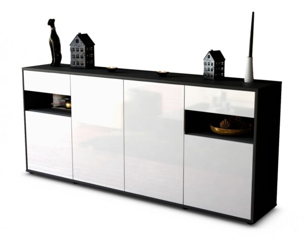 Dieses Sideboard hat Gesamt-Maße von 180x79x35cm. Viel Platz, eine leere Wand, kein passendes Möbelstück? Unsere 1,80 m lange Kommode ist die perfekte Lösung! Die Frontfarbe Hochglanz Weiß bringt als reine und unschuldige Farbe Ruhe in jeden Raum. Mit dem Glanz Weiss erzeugt man einen hochwertigen glänzenden Kontrast zu dunklen Wänden. Der anthrazit-matte Korpus harmoniert mit allen Farben und wirkt besonders edel im Kontrast zu hellen Wänden.