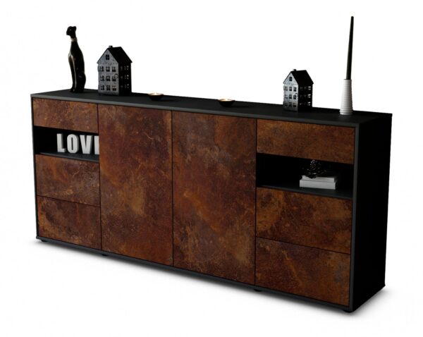 Dieses Sideboard hat Gesamt-Maße von 180x79x35cm. Viel Platz, eine leere Wand, kein passendes Möbelstück? Unsere 1,80 m lange Kommode ist die perfekte Lösung! Die Frontfarbe Rost wirkt antik und verleiht einen Retro Industrie-Look. Die Darstellung von alten, verwitterten oder verrosteten Metall / Eisen wirkt Rot-Braun bzw. Bronze-Farben. Der anthrazit-matte Korpus harmoniert mit allen Farben und wirkt besonders edel im Kontrast zu hellen Wänden.