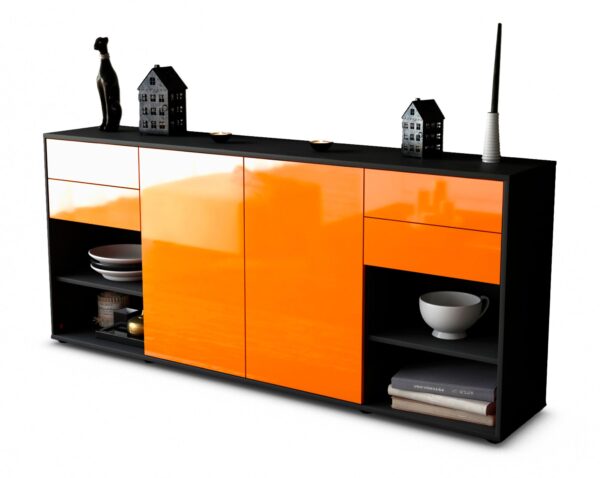 Dieses Sideboard hat Gesamt-Maße von 180x79x35cm. Viel Platz, eine leere Wand, kein passendes Möbelstück? Unsere 1,80 m lange Kommode ist die perfekte Lösung! Die Frontfarbe Hochglanz Mandarine überzeugt durch ein intensives Orange mit tollem Glanz. Fröhlich und gläzend wird diese Farbe jeden Raum für sich einehmen. Der anthrazit-matte Korpus harmoniert mit allen Farben und wirkt besonders edel im Kontrast zu hellen Wänden.