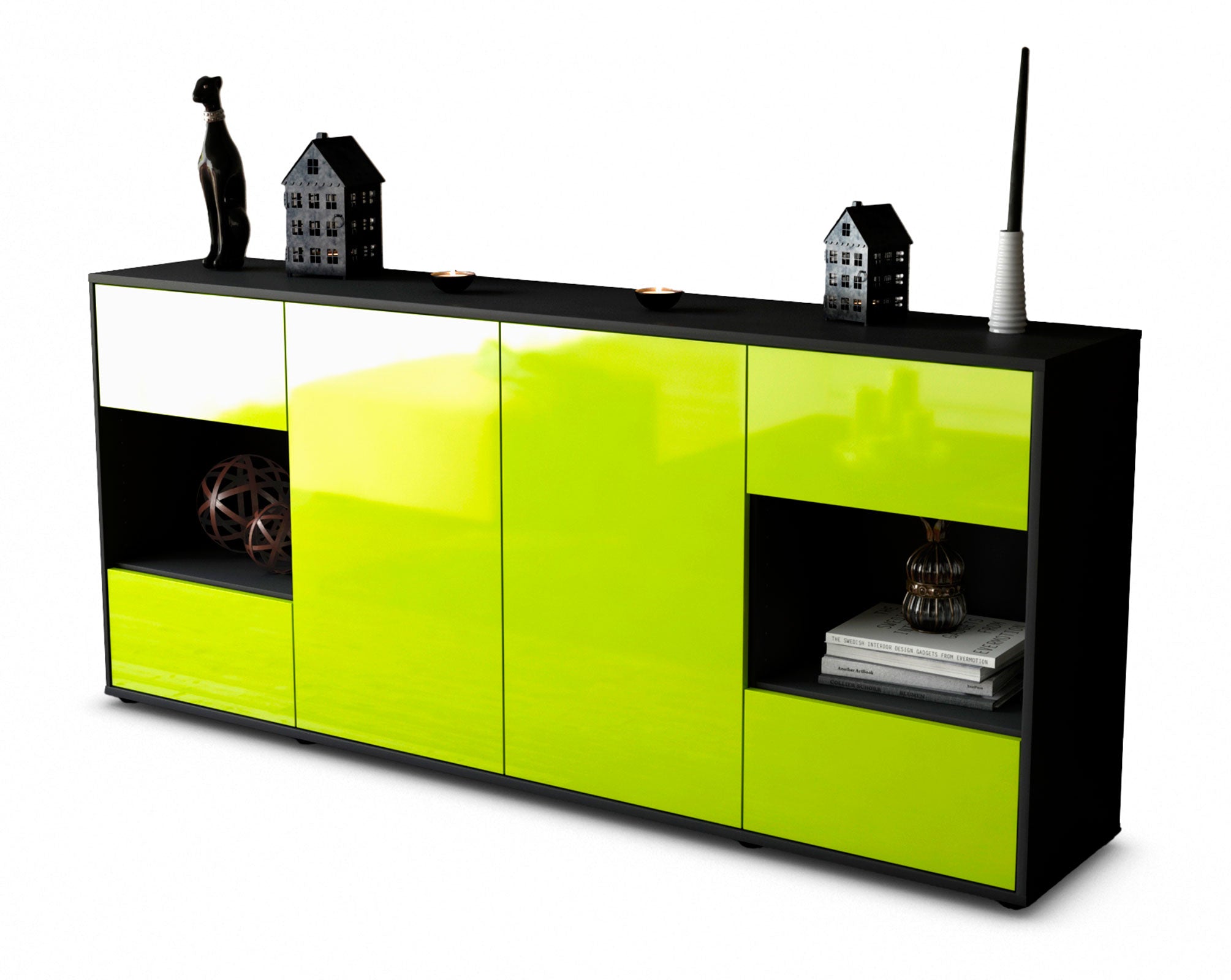Dieses Sideboard hat Gesamt-Maße von 180x79x35cm. Viel Platz, eine leere Wand, kein passendes Möbelstück? Unsere 1,80 m lange Kommode ist die perfekte Lösung! Die Frontfarbe Hochglanz Limettengrün bringt Schwung, Glanz und Farbe in jede Wohnung. Das knallig, leuchtende grün ist glänzend und wirkt wie ein frisches Apfelgrün oder eine saftige Limette. Der anthrazit-matte Korpus harmoniert mit allen Farben und wirkt besonders edel im Kontrast zu hellen Wänden.