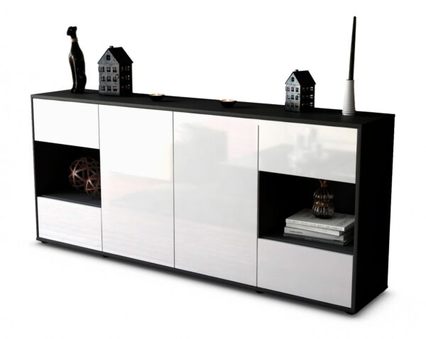 Dieses Sideboard hat Gesamt-Maße von 180x79x35cm. Viel Platz, eine leere Wand, kein passendes Möbelstück? Unsere 1,80 m lange Kommode ist die perfekte Lösung! Die Frontfarbe Hochglanz Weiß bringt als reine und unschuldige Farbe Ruhe in jeden Raum. Mit dem Glanz Weiss erzeugt man einen hochwertigen glänzenden Kontrast zu dunklen Wänden. Der anthrazit-matte Korpus harmoniert mit allen Farben und wirkt besonders edel im Kontrast zu hellen Wänden.