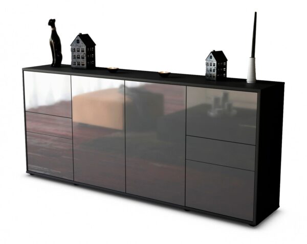 Dieses Sideboard hat Gesamt-Maße von 180x79x35cm. Viel Platz, eine leere Wand, kein passendes Möbelstück? Unsere 1,80 m lange Kommode ist die perfekte Lösung! Die Frontfarbe Hochglanz Graphit Grau ist zeitlos, schlicht und daher für jeden Wohnbereich glänzend geeignet. Anthrazit, dunkelgrau oder granit – diese Farbtöne bringen Stil & Glanz. Der anthrazit-matte Korpus harmoniert mit allen Farben und wirkt besonders edel im Kontrast zu hellen Wänden.