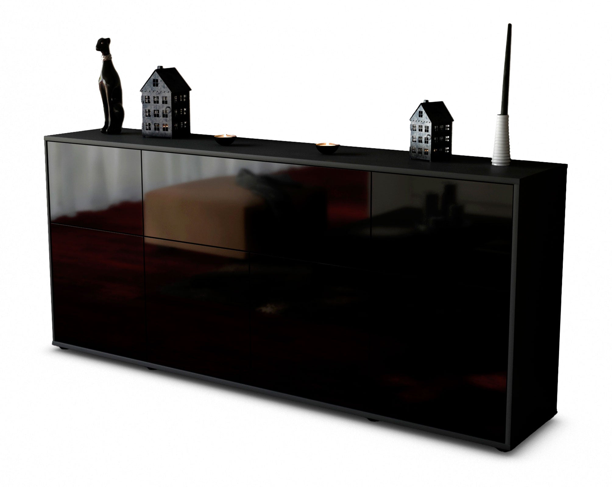 Dieses Sideboard hat Gesamt-Maße von 180x79x35cm. Viel Platz, eine leere Wand, kein passendes Möbelstück? Unsere 1,80 m lange Kommode ist die perfekte Lösung! Die Frontfarbe Hochglanz Schwarz ist eine der beliebtesten Möbelfarben. Glanz Dekore sind hoch modern und liegen immer im Trend. Die Front ist glänzend und und leicht spiegelnd. Der anthrazit-matte Korpus harmoniert mit allen Farben und wirkt besonders edel im Kontrast zu hellen Wänden.