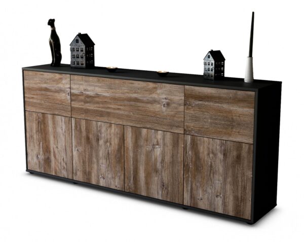 Dieses Sideboard hat Gesamt-Maße von 180x79x35cm. Viel Platz, eine leere Wand, kein passendes Möbelstück? Unsere 1,80 m lange Kommode ist die perfekte Lösung! Die Holz Front Treibholz Nachbildung ist ein gemütliches, dunkel grau mit einer schönen abgesetzten Holzmaserung. Das rustikale Holz strahlt Ruhe und Geborgenheit aus. Der anthrazit-matte Korpus harmoniert mit allen Farben und wirkt besonders edel im Kontrast zu hellen Wänden.