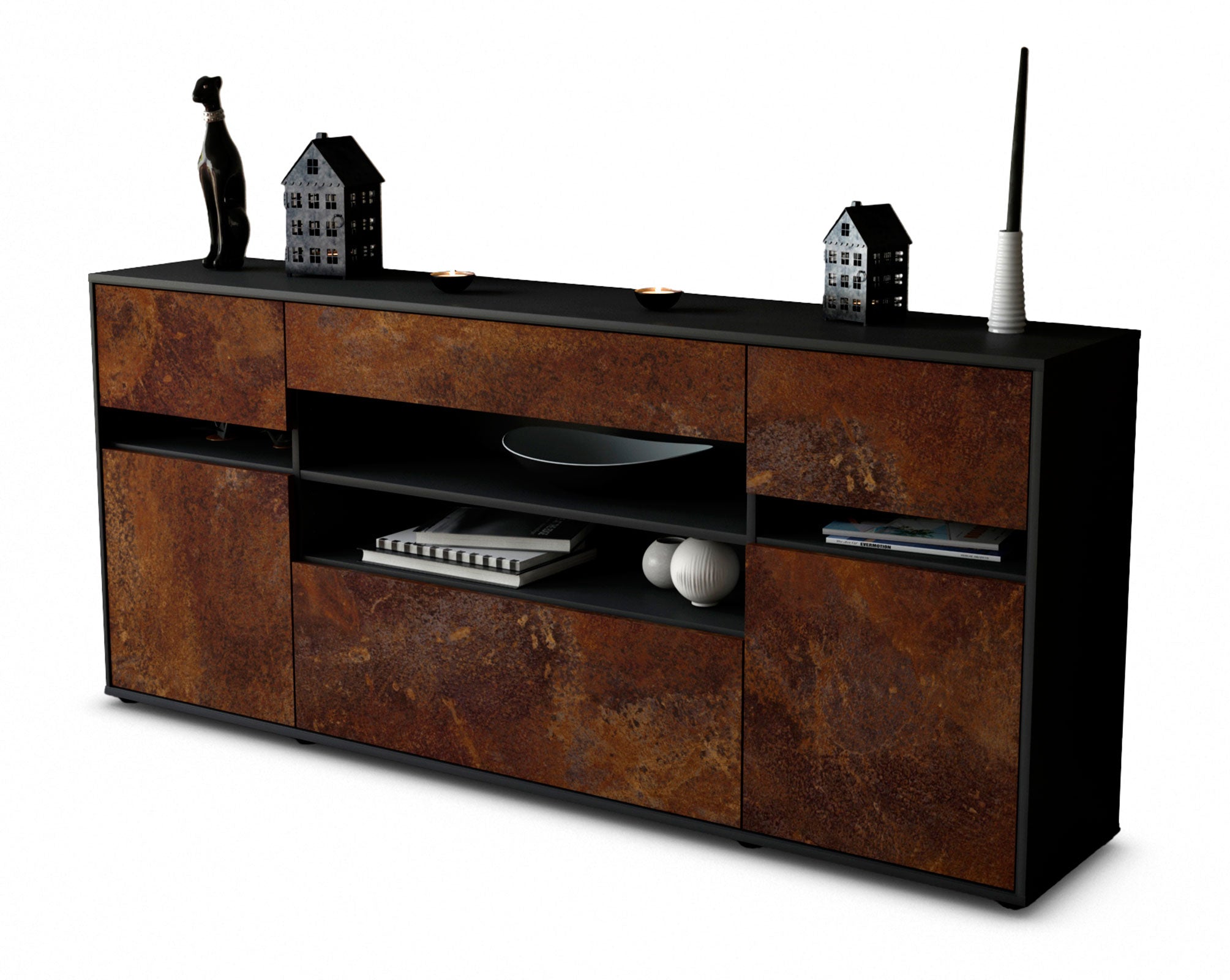 Dieses Sideboard hat Gesamt-Maße von 180x79x35cm. Viel Platz, eine leere Wand, kein passendes Möbelstück? Unsere 1,80 m lange Kommode ist die perfekte Lösung! Die Frontfarbe Rost wirkt antik und verleiht einen Retro Industrie-Look. Die Darstellung von alten, verwitterten oder verrosteten Metall / Eisen wirkt Rot-Braun bzw. Bronze-Farben. Der anthrazit-matte Korpus harmoniert mit allen Farben und wirkt besonders edel im Kontrast zu hellen Wänden.