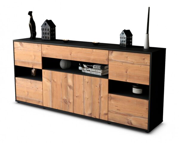 Dieses Sideboard hat Gesamt-Maße von 180x79x35cm. Viel Platz, eine leere Wand, kein passendes Möbelstück? Unsere 1,80 m lange Kommode ist die perfekte Lösung! Die Holz Front Pinie Nachbildung ist ein freundliches Braun mit farblich abgesetzter Holzmaserung. Die Integrierung in Wohnräume ist durch das warme Holz leicht möglich. Der anthrazit-matte Korpus harmoniert mit allen Farben und wirkt besonders edel im Kontrast zu hellen Wänden.