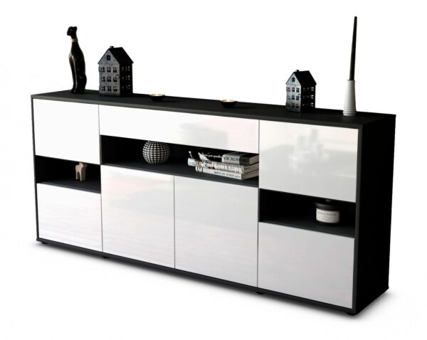 Dieses Sideboard hat Gesamt-Maße von 180x79x35cm. Viel Platz, eine leere Wand, kein passendes Möbelstück? Unsere 1,80 m lange Kommode ist die perfekte Lösung! Die Frontfarbe Hochglanz Weiß bringt als reine und unschuldige Farbe Ruhe in jeden Raum. Mit dem Glanz Weiss erzeugt man einen hochwertigen glänzenden Kontrast zu dunklen Wänden. Der anthrazit-matte Korpus harmoniert mit allen Farben und wirkt besonders edel im Kontrast zu hellen Wänden.