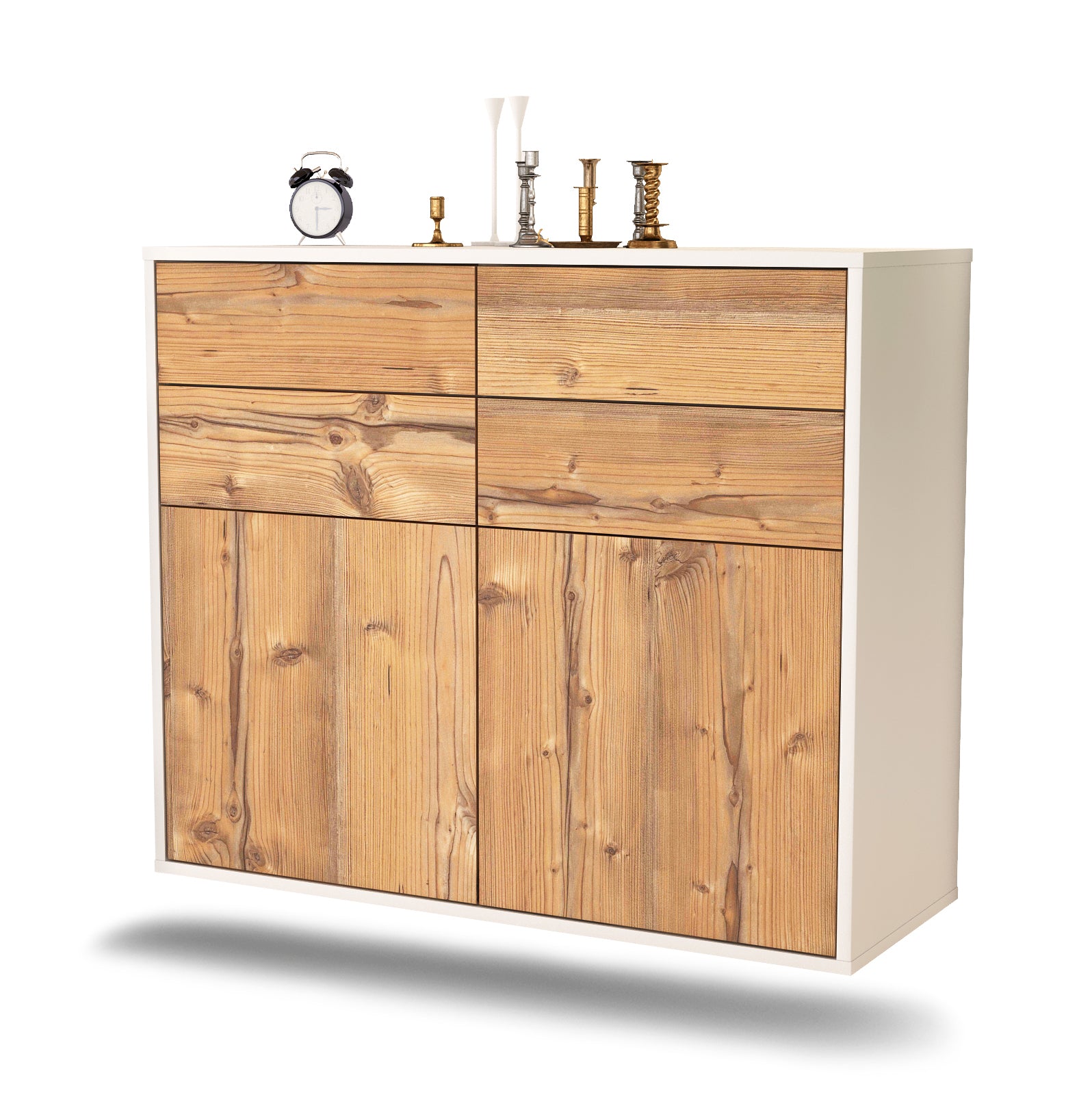 Dieses Sideboard hat Gesamt-Maße von 92x79x35cm. Viel Platz, eine leere Wand, kein passendes Möbelstück? Unsere 92 cm lange Kommode ist die perfekte Lösung! Die Holz Front Pinie Nachbildung ist ein freundliches Braun mit farblich abgesetzter Holzmaserung. Die Integrierung in Wohnräume ist durch das warme Holz leicht möglich. Der weiße matte Korpus kann überall integriert werden. Mit der beruhigenden Farbe weiß, findet sich leicht Stellplatz für dieses schöne Möbelstück.