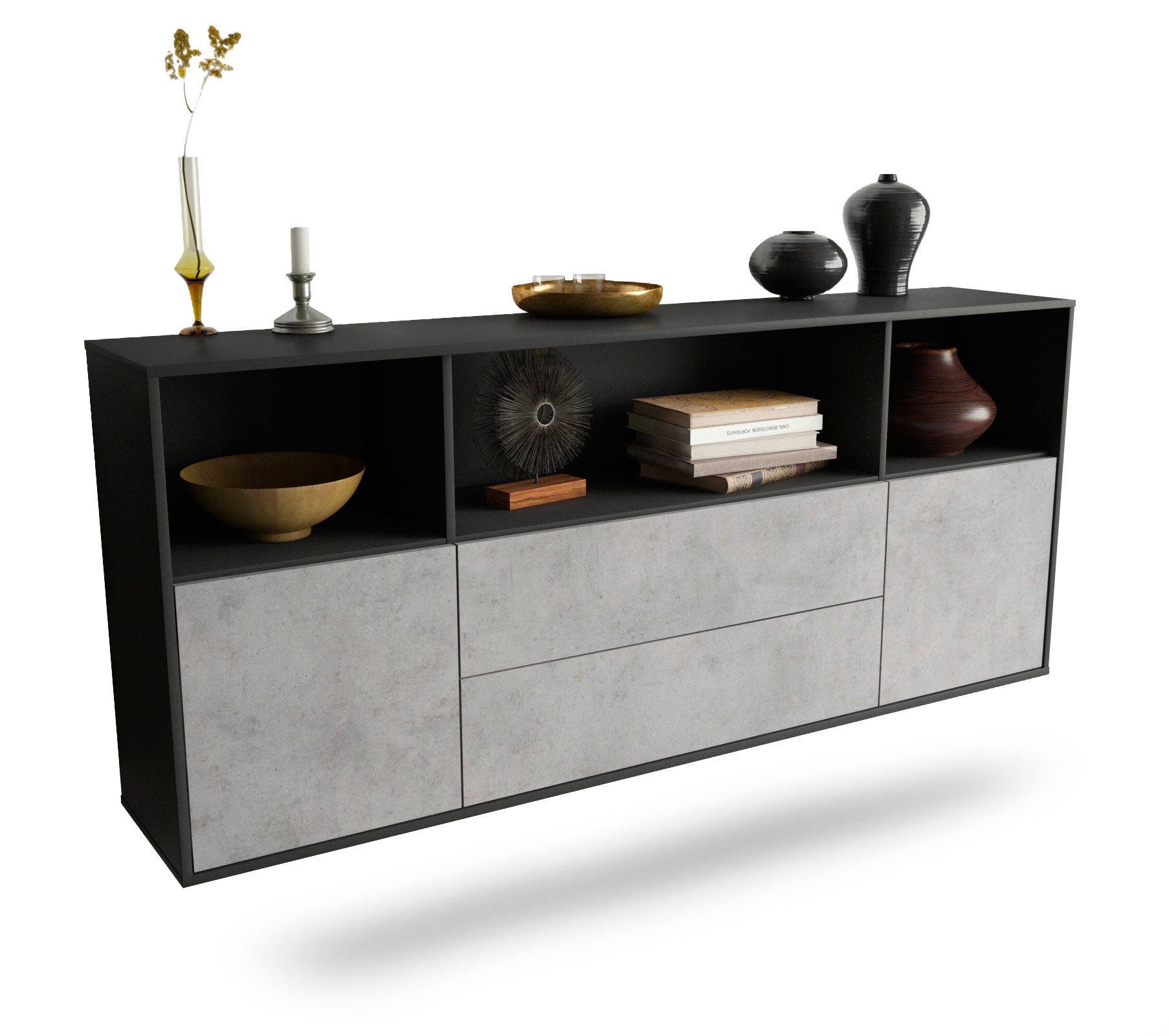 Dieses Sideboard hat Gesamt-Maße von 180x79x35cm. Viel Platz, eine leere Wand, kein passendes Möbelstück? Unsere 1,80 m lange Kommode ist die perfekte Lösung! Die Frontfarbe Beton wirkt zeitlos und hoch modern. Die steinähnliche Nachbildung zeigt sich als klassisch, stilvolles Grau meliert. Die Betonoptik im Industrie-Look liegt gerade voll im Trend. Der anthrazit-matte Korpus harmoniert mit allen Farben und wirkt besonders edel im Kontrast zu hellen Wänden.