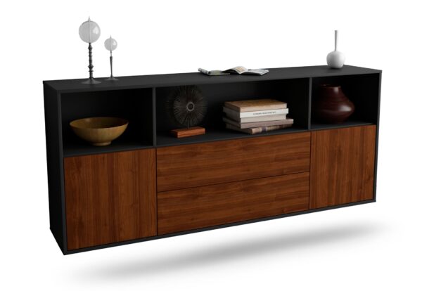 Dieses Sideboard hat Gesamt-Maße von 180x79x35cm. Viel Platz, eine leere Wand, kein passendes Möbelstück? Unsere 1,80 m lange Kommode ist die perfekte Lösung! Die Holz Front Walnuss Nachbildung wirkt mit einem dunklen und intensiven Braun sehr einladend. Das dunkel erscheinende Holz passt sehr gut zu einem gemütlichen Einrichtungsstil. Der anthrazit-matte Korpus harmoniert mit allen Farben und wirkt besonders edel im Kontrast zu hellen Wänden.