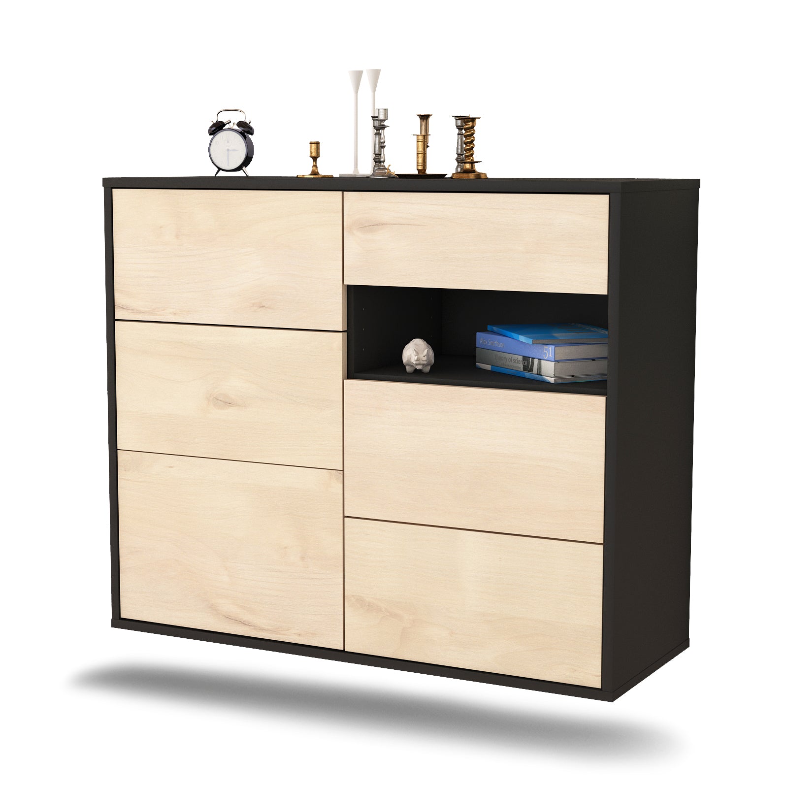 Dieses Sideboard hat Gesamt-Maße von 92x79x35cm. Viel Platz, eine leere Wand, kein passendes Möbelstück? Unsere 92 cm lange Kommode ist die perfekte Lösung! Die Holz Front Zeder Nachbildung ist ein Holz Dekor welches sehr hell und mit einer dezenten Holzmaserung punktet. Durch das frische Dekor ist der Schrank ideal für alle Räume geeignet. Der anthrazit-matte Korpus harmoniert mit allen Farben und wirkt besonders edel im Kontrast zu hellen Wänden.