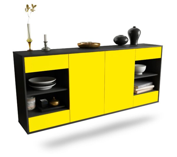 Dieses Sideboard hat Gesamt-Maße von 180x79x35cm. Viel Platz, eine leere Wand, kein passendes Möbelstück? Unsere 1,80 m lange Kommode ist die perfekte Lösung! Die Frontfarbe Sonnengelb verleiht Räumen Freude und positive Energie ohne diesen farblich zu überfluten. Der eher gelb pastell Ton verschafft eine frische Atmosphäre.Der anthrazit-matte Korpus harmoniert mit allen Farben und wirkt besonders edel im Kontrast zu hellen Wänden.