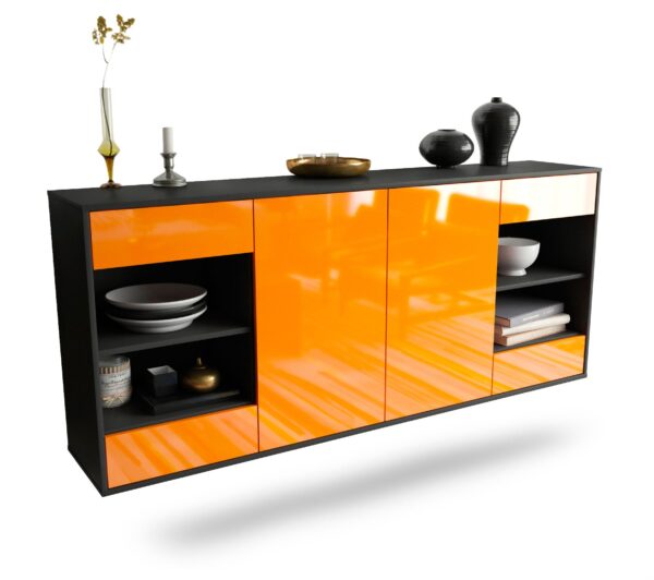 Dieses Sideboard hat Gesamt-Maße von 180x79x35cm. Viel Platz, eine leere Wand, kein passendes Möbelstück? Unsere 1,80 m lange Kommode ist die perfekte Lösung! Die Frontfarbe Hochglanz Mandarine überzeugt durch ein intensives Orange mit tollem Glanz. Fröhlich und gläzend wird diese Farbe jeden Raum für sich einehmen. Der anthrazit-matte Korpus harmoniert mit allen Farben und wirkt besonders edel im Kontrast zu hellen Wänden.