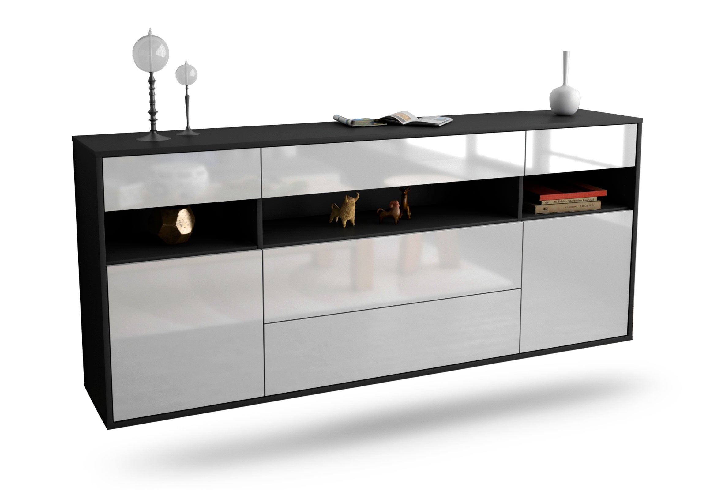 Dieses Sideboard hat Gesamt-Maße von 180x79x35cm. Viel Platz, eine leere Wand, kein passendes Möbelstück? Unsere 1,80 m lange Kommode ist die perfekte Lösung! Die Frontfarbe Hochglanz Weiß bringt als reine und unschuldige Farbe Ruhe in jeden Raum. Mit dem Glanz Weiss erzeugt man einen hochwertigen glänzenden Kontrast zu dunklen Wänden. Der anthrazit-matte Korpus harmoniert mit allen Farben und wirkt besonders edel im Kontrast zu hellen Wänden.