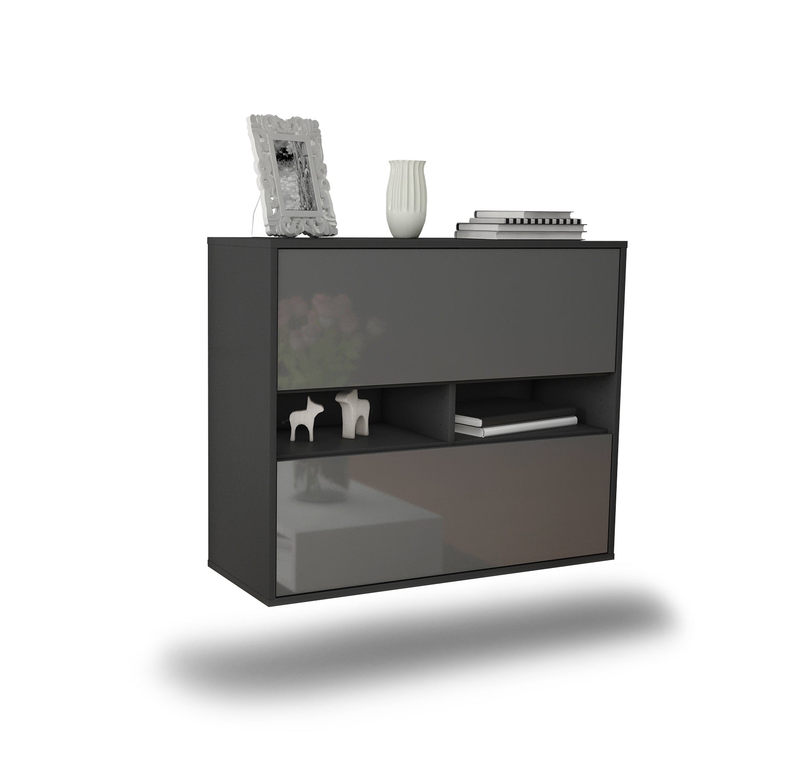 Dieses Sideboard hat Gesamt-Maße von 92x79x35cm. Viel Platz, eine leere Wand, kein passendes Möbelstück? Unsere 92 cm lange Kommode ist die perfekte Lösung! Die Frontfarbe Hochglanz Graphit Grau ist zeitlos, schlicht und daher für jeden Wohnbereich glänzend geeignet. Anthrazit, dunkelgrau oder granit – diese Farbtöne bringen Stil & Glanz. Der anthrazit-matte Korpus harmoniert mit allen Farben und wirkt besonders edel im Kontrast zu hellen Wänden.