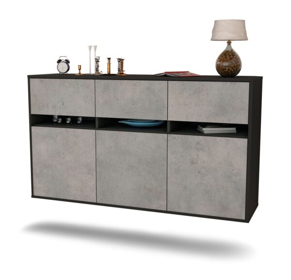 Dieses Sideboard hat Gesamt-Maße von 136x79x35cm. Viel Platz, eine leere Wand, kein passendes Möbelstück? Unsere 1,36 m lange Kommode ist die perfekte Lösung! Die Frontfarbe Beton wirkt zeitlos und hoch modern. Die steinähnliche Nachbildung zeigt sich als klassisch, stilvolles Grau meliert. Die Betonoptik im Industrie-Look liegt gerade voll im Trend. Der anthrazit-matte Korpus harmoniert mit allen Farben und wirkt besonders edel im Kontrast zu hellen Wänden.