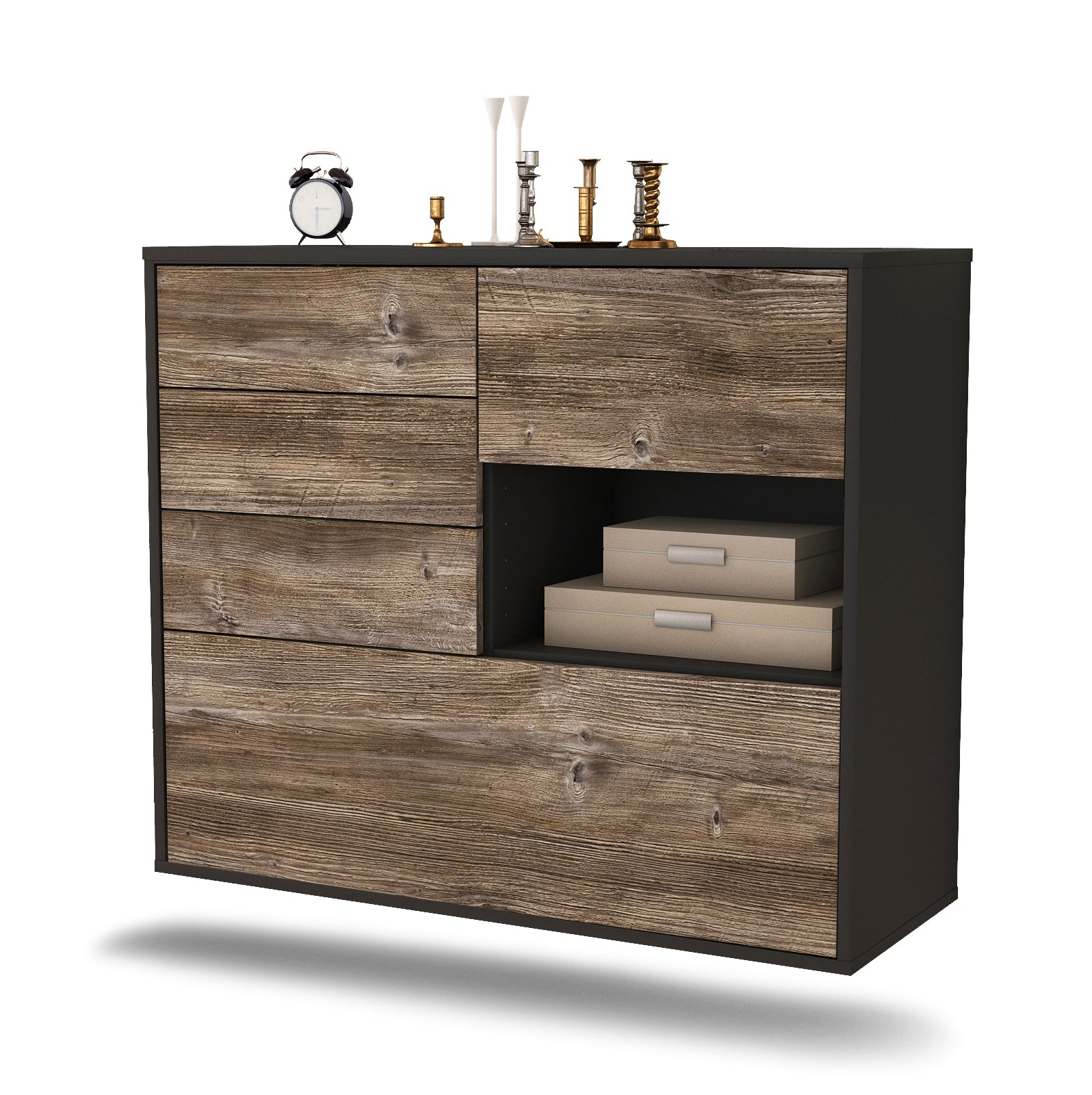 Dieses Sideboard hat Gesamt-Maße von 92x79x35cm. Viel Platz, eine leere Wand, kein passendes Möbelstück? Unsere 92 cm lange Kommode ist die perfekte Lösung! Die Holz Front Treibholz Nachbildung ist ein gemütliches, dunkel grau mit einer schönen abgesetzten Holzmaserung. Das rustikale Holz strahlt Ruhe und Geborgenheit aus. Der anthrazit-matte Korpus harmoniert mit allen Farben und wirkt besonders edel im Kontrast zu hellen Wänden.