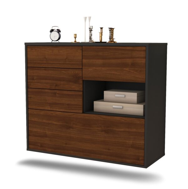 Dieses Sideboard hat Gesamt-Maße von 92x79x35cm. Viel Platz, eine leere Wand, kein passendes Möbelstück? Unsere 92 cm lange Kommode ist die perfekte Lösung! Die Holz Front Walnuss Nachbildung wirkt mit einem dunklen und intensiven Braun sehr einladend. Das dunkel erscheinende Holz passt sehr gut zu einem gemütlichen Einrichtungsstil. Der anthrazit-matte Korpus harmoniert mit allen Farben und wirkt besonders edel im Kontrast zu hellen Wänden.