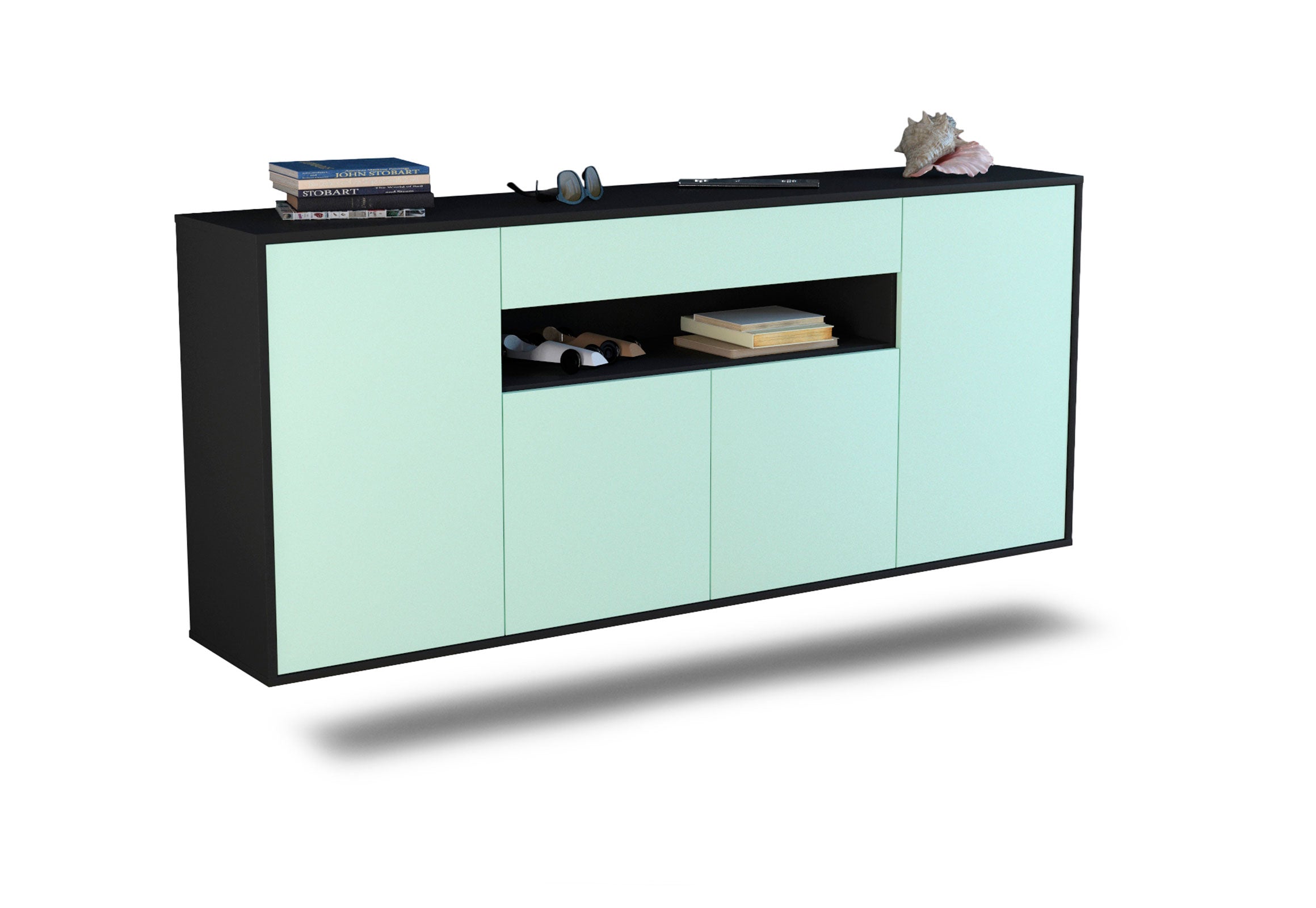 Dieses Sideboard hat Gesamt-Maße von 180x79x35cm. Viel Platz, eine leere Wand, kein passendes Möbelstück? Unsere 1,80 m lange Kommode ist die perfekte Lösung! Die Frontfarbe Eisblau verleiht Ihrem Raum Frische. Das Himmelblau fördert eine sanfte Atmosphäre. Die Farben Hellblau und Mint werden gerne für moderne Wohnräume verwendet. Der anthrazit-matte Korpus harmoniert mit allen Farben und wirkt besonders edel im Kontrast zu hellen Wänden.