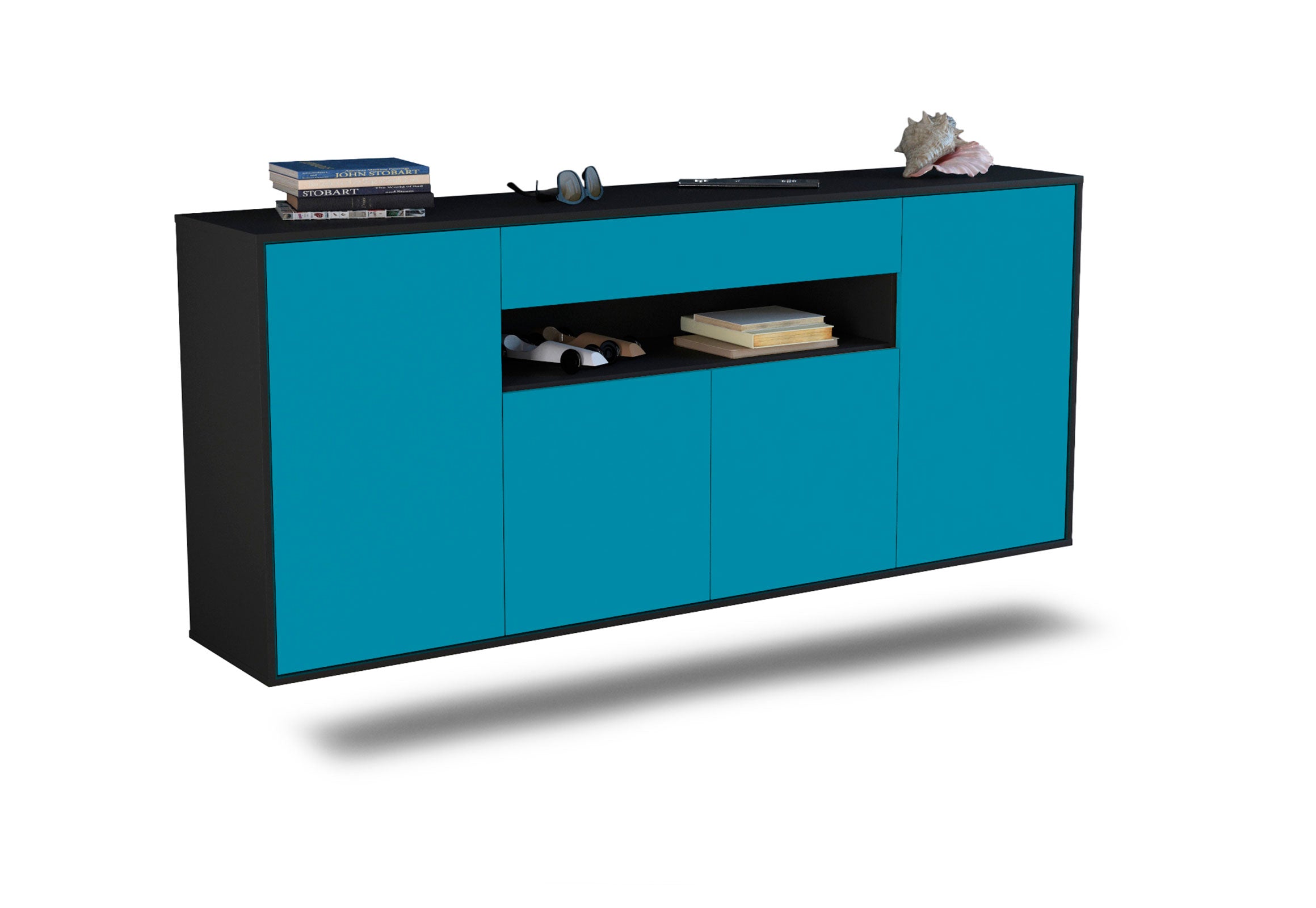 Dieses Sideboard hat Gesamt-Maße von 180x79x35cm. Viel Platz, eine leere Wand, kein passendes Möbelstück? Unsere 1,80 m lange Kommode ist die perfekte Lösung! Die Frontfarbe im freundlichen Lagunenblau bringt das schöne Wetter in jedes Zuhause. Das intensive Türkis erinnert an die Karibik und schafft tagtägich einen zusätzlichen Erhoungsfaktor. Der anthrazit-matte Korpus harmoniert mit allen Farben und wirkt besonders edel im Kontrast zu hellen Wänden.