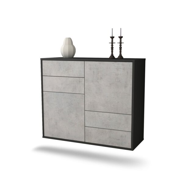 Dieses Sideboard hat Gesamt-Maße von 92x79x35cm. Viel Platz, eine leere Wand, kein passendes Möbelstück? Unsere 92 cm lange Kommode ist die perfekte Lösung! Die Frontfarbe Beton wirkt zeitlos und hoch modern. Die steinähnliche Nachbildung zeigt sich als klassisch, stilvolles Grau meliert. Die Betonoptik im Industrie-Look liegt gerade voll im Trend. Der anthrazit-matte Korpus harmoniert mit allen Farben und wirkt besonders edel im Kontrast zu hellen Wänden.