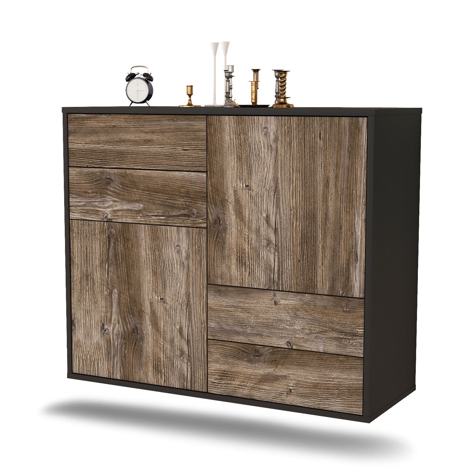 Dieses Sideboard hat Gesamt-Maße von 92x79x35cm. Viel Platz, eine leere Wand, kein passendes Möbelstück? Unsere 92 cm lange Kommode ist die perfekte Lösung! Die Holz Front Treibholz Nachbildung ist ein gemütliches, dunkel grau mit einer schönen abgesetzten Holzmaserung. Das rustikale Holz strahlt Ruhe und Geborgenheit aus. Der anthrazit-matte Korpus harmoniert mit allen Farben und wirkt besonders edel im Kontrast zu hellen Wänden.