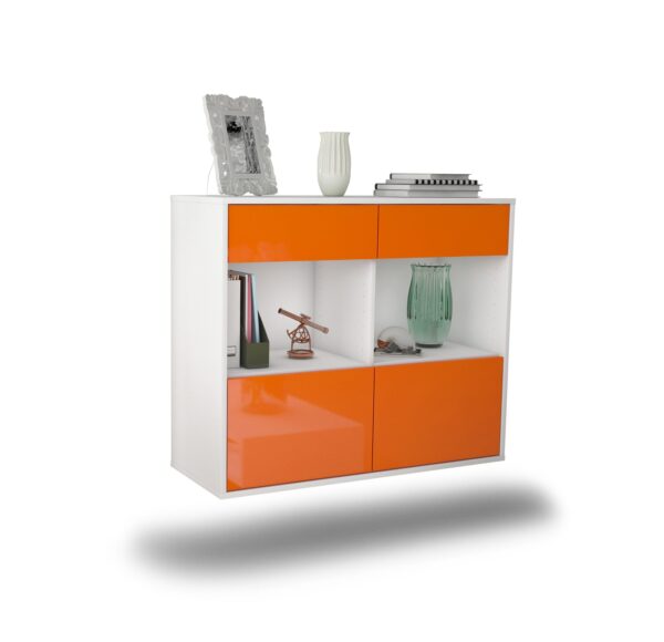 Dieses Sideboard hat Gesamt-Maße von 92x79x35cm. Viel Platz, eine leere Wand, kein passendes Möbelstück? Unsere 92 cm lange Kommode ist die perfekte Lösung! Die Frontfarbe Hochglanz Mandarine überzeugt durch ein intensives Orange mit tollem Glanz. Fröhlich und gläzend wird diese Farbe jeden Raum für sich einehmen. Der weiße matte Korpus kann überall integriert werden. Mit der beruhigenden Farbe weiß, findet sich leicht Stellplatz für dieses schöne Möbelstück.