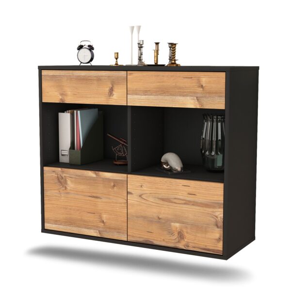 Dieses Sideboard hat Gesamt-Maße von 92x79x35cm. Viel Platz, eine leere Wand, kein passendes Möbelstück? Unsere 92 cm lange Kommode ist die perfekte Lösung! Die Holz Front Pinie Nachbildung ist ein freundliches Braun mit farblich abgesetzter Holzmaserung. Die Integrierung in Wohnräume ist durch das warme Holz leicht möglich. Der anthrazit-matte Korpus harmoniert mit allen Farben und wirkt besonders edel im Kontrast zu hellen Wänden.