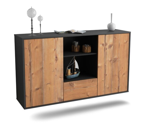 Dieses Sideboard hat Gesamt-Maße von 136x79x35cm. Viel Platz, eine leere Wand, kein passendes Möbelstück? Unsere 1,36 m lange Kommode ist die perfekte Lösung! Die Holz Front Pinie Nachbildung ist ein freundliches Braun mit farblich abgesetzter Holzmaserung. Die Integrierung in Wohnräume ist durch das warme Holz leicht möglich. Der anthrazit-matte Korpus harmoniert mit allen Farben und wirkt besonders edel im Kontrast zu hellen Wänden.
