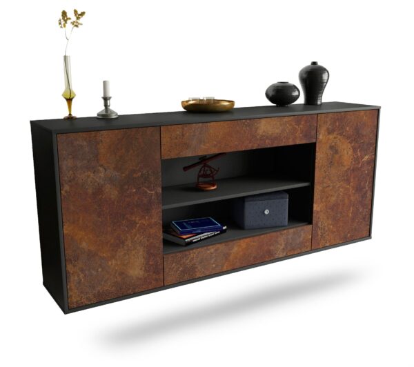 Dieses Sideboard hat Gesamt-Maße von 180x79x35cm. Viel Platz, eine leere Wand, kein passendes Möbelstück? Unsere 1,80 m lange Kommode ist die perfekte Lösung! Die Frontfarbe Rost wirkt antik und verleiht einen Retro Industrie-Look. Die Darstellung von alten, verwitterten oder verrosteten Metall / Eisen wirkt Rot-Braun bzw. Bronze-Farben. Der anthrazit-matte Korpus harmoniert mit allen Farben und wirkt besonders edel im Kontrast zu hellen Wänden.