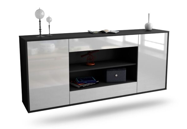 Dieses Sideboard hat Gesamt-Maße von 180x79x35cm. Viel Platz, eine leere Wand, kein passendes Möbelstück? Unsere 1,80 m lange Kommode ist die perfekte Lösung! Die Frontfarbe Hochglanz Weiß bringt als reine und unschuldige Farbe Ruhe in jeden Raum. Mit dem Glanz Weiss erzeugt man einen hochwertigen glänzenden Kontrast zu dunklen Wänden. Der anthrazit-matte Korpus harmoniert mit allen Farben und wirkt besonders edel im Kontrast zu hellen Wänden.