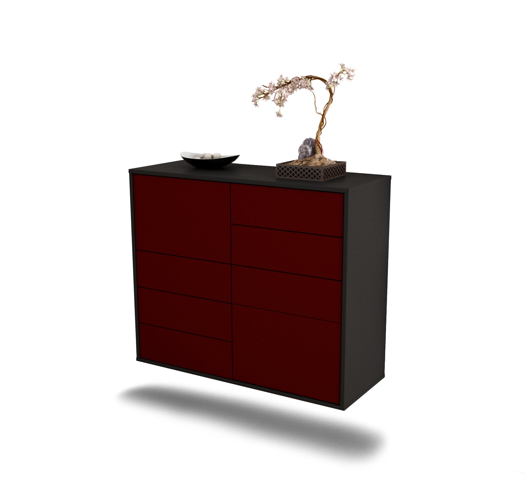 Dieses Sideboard hat Gesamt-Maße von 92x79x35cm. Viel Platz, eine leere Wand, kein passendes Möbelstück? Unsere 92 cm lange Kommode ist die perfekte Lösung! Die Frontfarbe dunkles Bordeaux Rot bringt Wärme ins Haus. Das intensive Weinrot ist einer der edelsten Rot Töne und verleiht jeder Einrichtung einen Glamour Faktor.Der anthrazit-matte Korpus harmoniert mit allen Farben und wirkt besonders edel im Kontrast zu hellen Wänden.