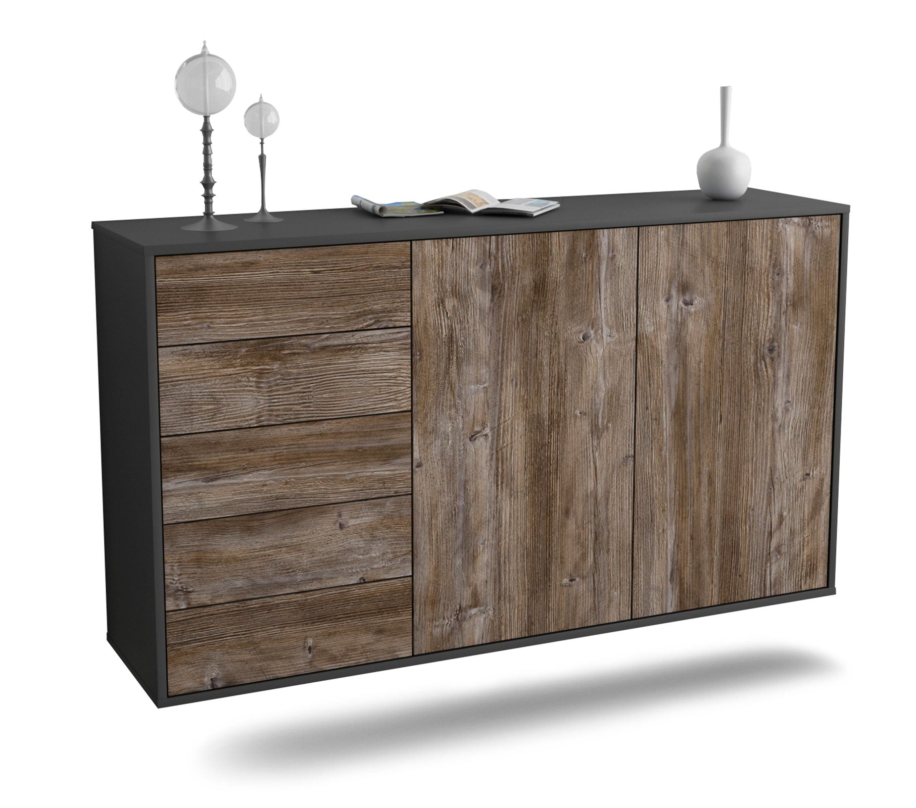 Dieses Sideboard hat Gesamt-Maße von 136x79x35cm. Viel Platz, eine leere Wand, kein passendes Möbelstück? Unsere 1,36 m lange Kommode ist die perfekte Lösung! Die Holz Front Treibholz Nachbildung ist ein gemütliches, dunkel grau mit einer schönen abgesetzten Holzmaserung. Das rustikale Holz strahlt Ruhe und Geborgenheit aus. Der anthrazit-matte Korpus harmoniert mit allen Farben und wirkt besonders edel im Kontrast zu hellen Wänden.