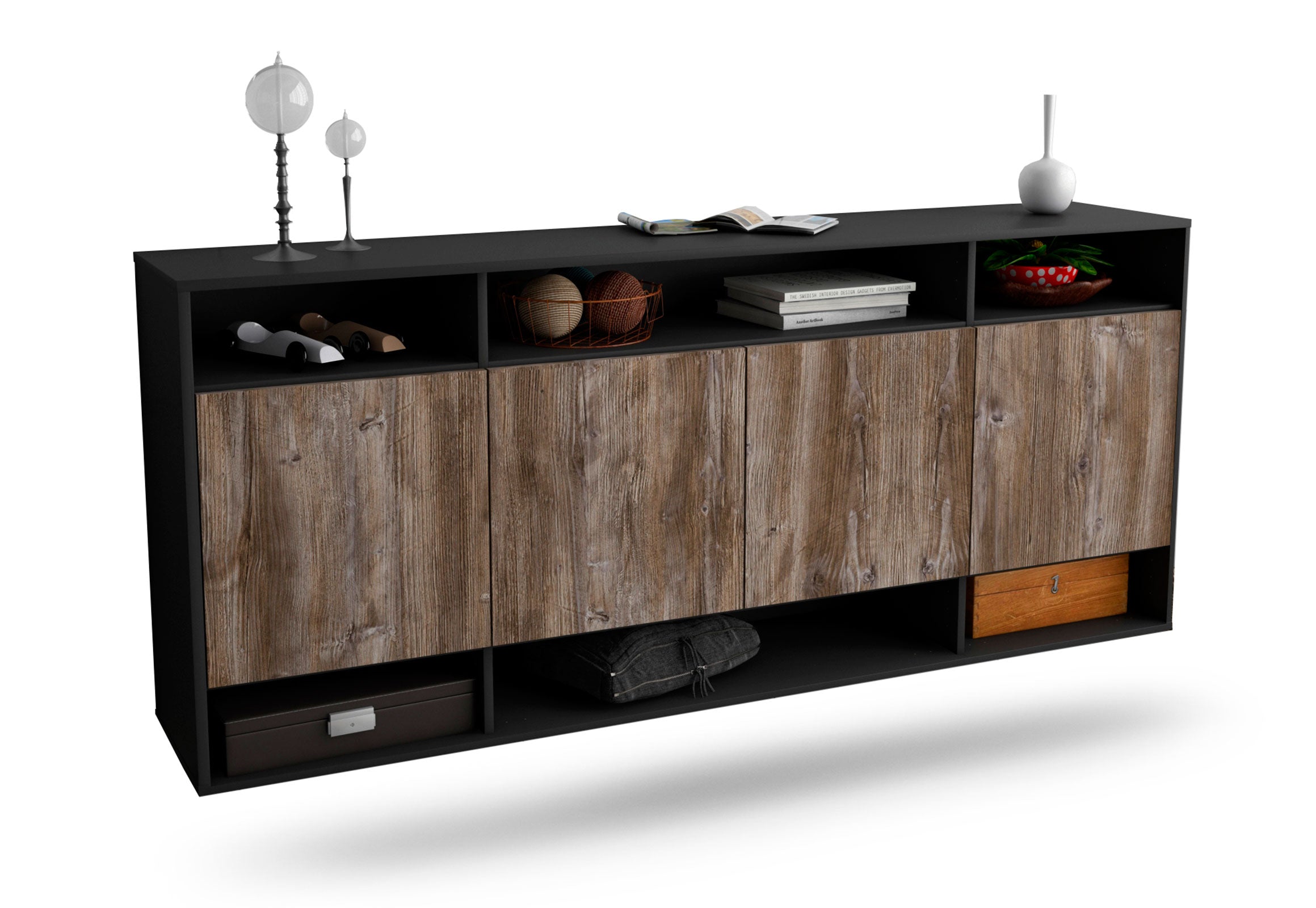 Dieses Sideboard hat Gesamt-Maße von 180x79x35cm. Viel Platz, eine leere Wand, kein passendes Möbelstück? Unsere 1,80 m lange Kommode ist die perfekte Lösung! Die Holz Front Treibholz Nachbildung ist ein gemütliches, dunkel grau mit einer schönen abgesetzten Holzmaserung. Das rustikale Holz strahlt Ruhe und Geborgenheit aus. Der anthrazit-matte Korpus harmoniert mit allen Farben und wirkt besonders edel im Kontrast zu hellen Wänden.