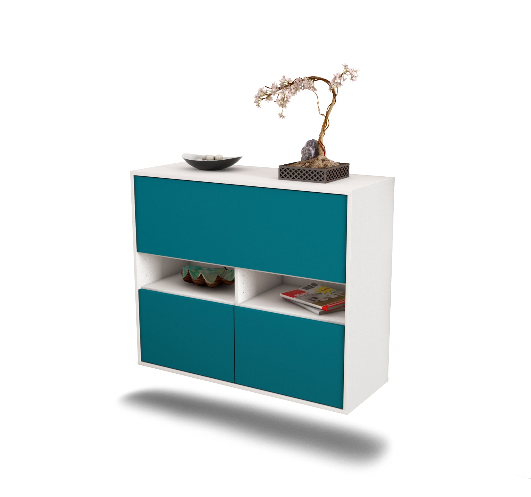 Dieses Sideboard hat Gesamt-Maße von 92x79x35cm. Viel Platz, eine leere Wand, kein passendes Möbelstück? Unsere 92 cm lange Kommode ist die perfekte Lösung! Die Frontfarbe im freundlichen Lagunenblau bringt das schöne Wetter in jedes Zuhause. Das intensive Türkis erinnert an die Karibik und schafft tagtägich einen zusätzlichen Erhoungsfaktor. Der weiße matte Korpus kann überall integriert werden. Mit der beruhigenden Farbe weiß, findet sich leicht Stellplatz für dieses schöne Möbelstück.
