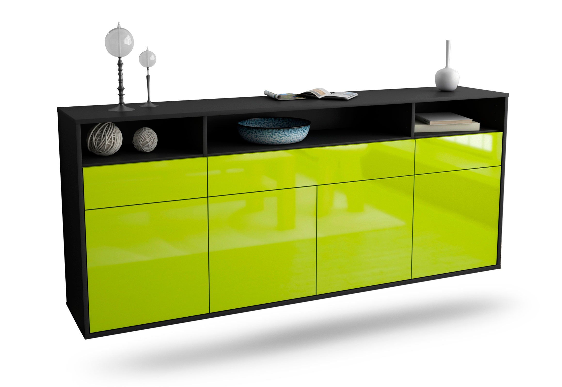 Dieses Sideboard hat Gesamt-Maße von 180x79x35cm. Viel Platz, eine leere Wand, kein passendes Möbelstück? Unsere 1,80 m lange Kommode ist die perfekte Lösung! Die Frontfarbe Hochglanz Limettengrün bringt Schwung, Glanz und Farbe in jede Wohnung. Das knallig, leuchtende grün ist glänzend und wirkt wie ein frisches Apfelgrün oder eine saftige Limette. Der anthrazit-matte Korpus harmoniert mit allen Farben und wirkt besonders edel im Kontrast zu hellen Wänden.