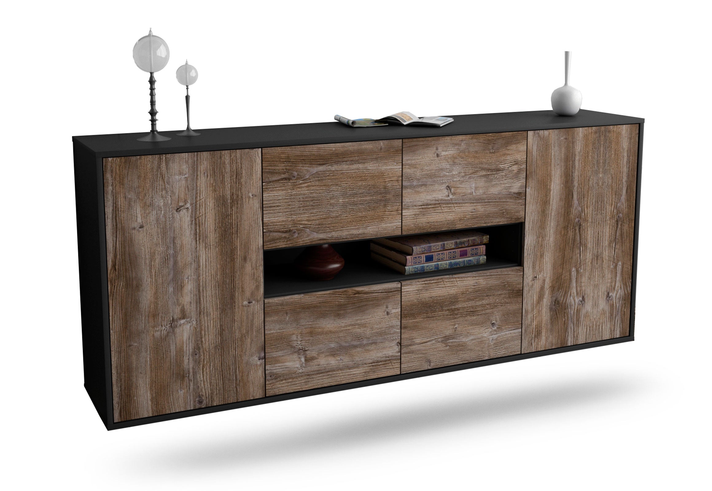 Dieses Sideboard hat Gesamt-Maße von 180x79x35cm. Viel Platz, eine leere Wand, kein passendes Möbelstück? Unsere 1,80 m lange Kommode ist die perfekte Lösung! Die Holz Front Treibholz Nachbildung ist ein gemütliches, dunkel grau mit einer schönen abgesetzten Holzmaserung. Das rustikale Holz strahlt Ruhe und Geborgenheit aus. Der anthrazit-matte Korpus harmoniert mit allen Farben und wirkt besonders edel im Kontrast zu hellen Wänden.