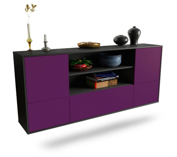 Dieses Sideboard hat Gesamt-Maße von 180x79x35cm. Viel Platz, eine leere Wand, kein passendes Möbelstück? Unsere 1,80 m lange Kommode ist die perfekte Lösung! Die Frontfarbe im kräftigen Aubergine wirkt als Farbtupfer in allen Räumlichkeiten. Lila, violett und Brombeer Töne versprühen Glamour und Eleganz. Der anthrazit-matte Korpus harmoniert mit allen Farben und wirkt besonders edel im Kontrast zu hellen Wänden.