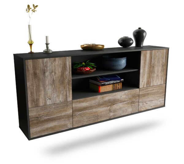 Dieses Sideboard hat Gesamt-Maße von 180x79x35cm. Viel Platz, eine leere Wand, kein passendes Möbelstück? Unsere 1,80 m lange Kommode ist die perfekte Lösung! Die Holz Front Treibholz Nachbildung ist ein gemütliches, dunkel grau mit einer schönen abgesetzten Holzmaserung. Das rustikale Holz strahlt Ruhe und Geborgenheit aus. Der anthrazit-matte Korpus harmoniert mit allen Farben und wirkt besonders edel im Kontrast zu hellen Wänden.