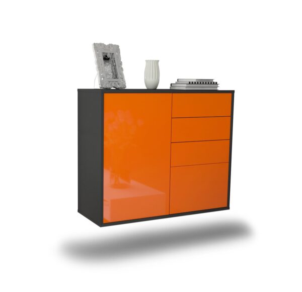 Dieses Sideboard hat Gesamt-Maße von 92x79x35cm. Viel Platz, eine leere Wand, kein passendes Möbelstück? Unsere 92 cm lange Kommode ist die perfekte Lösung! Die Frontfarbe Hochglanz Mandarine überzeugt durch ein intensives Orange mit tollem Glanz. Fröhlich und gläzend wird diese Farbe jeden Raum für sich einehmen. Der anthrazit-matte Korpus harmoniert mit allen Farben und wirkt besonders edel im Kontrast zu hellen Wänden.