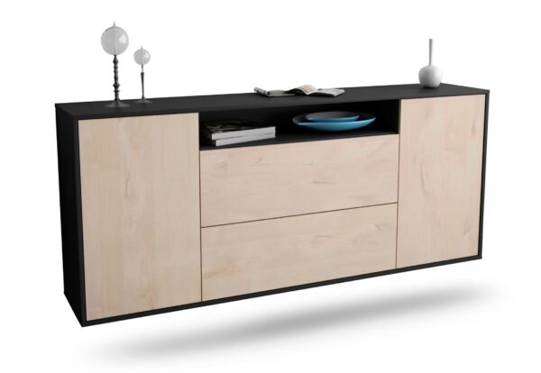 Dieses Sideboard hat Gesamt-Maße von 180x79x35cm. Viel Platz, eine leere Wand, kein passendes Möbelstück? Unsere 1,80 m lange Kommode ist die perfekte Lösung! Die Holz Front Zeder Nachbildung ist ein Holz Dekor welches sehr hell und mit einer dezenten Holzmaserung punktet. Durch das frische Dekor ist der Schrank ideal für alle Räume geeignet. Der anthrazit-matte Korpus harmoniert mit allen Farben und wirkt besonders edel im Kontrast zu hellen Wänden.
