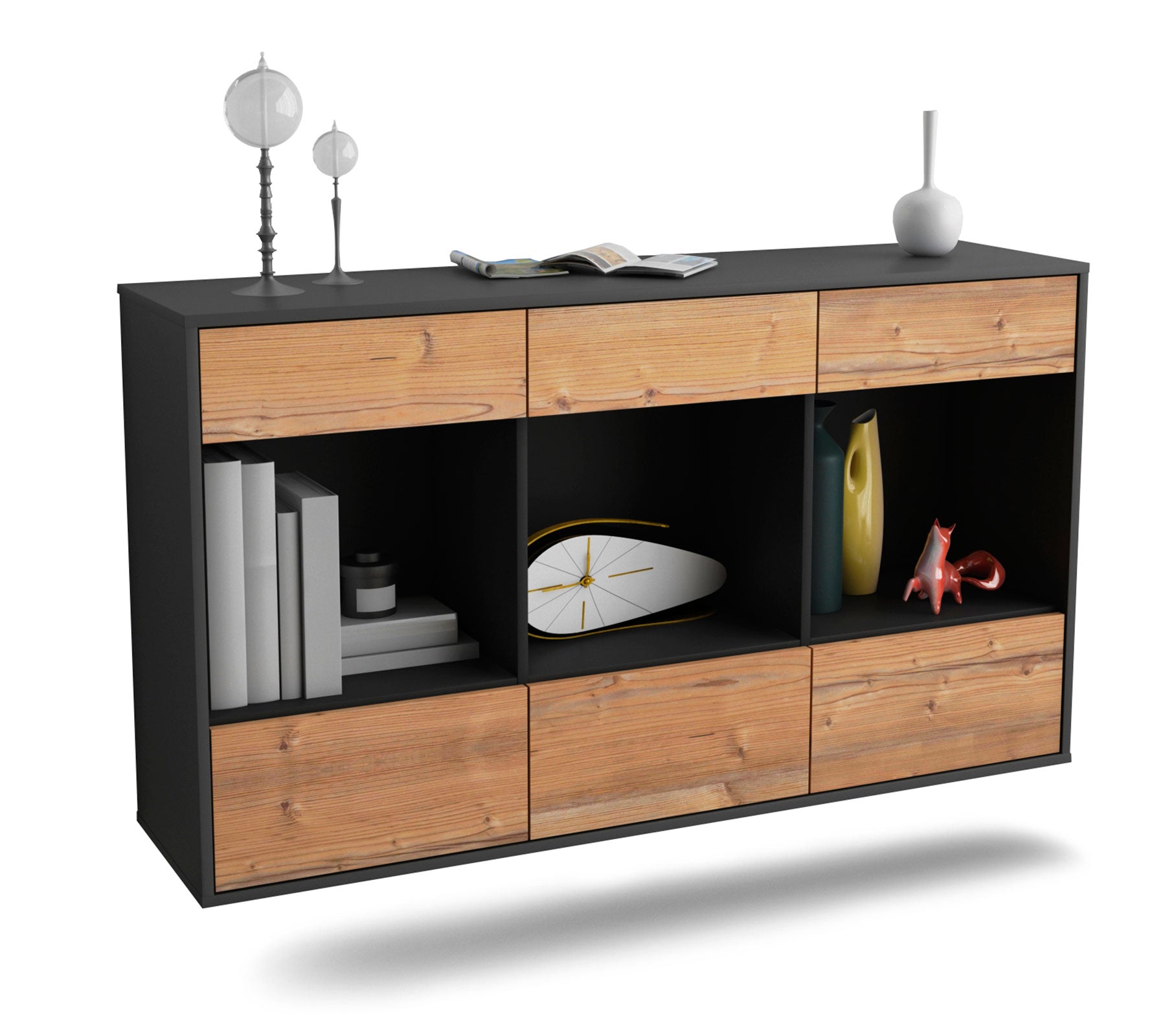 Dieses Sideboard hat Gesamt-Maße von 136x79x35cm. Viel Platz, eine leere Wand, kein passendes Möbelstück? Unsere 1,36 m lange Kommode ist die perfekte Lösung! Die Holz Front Pinie Nachbildung ist ein freundliches Braun mit farblich abgesetzter Holzmaserung. Die Integrierung in Wohnräume ist durch das warme Holz leicht möglich. Der anthrazit-matte Korpus harmoniert mit allen Farben und wirkt besonders edel im Kontrast zu hellen Wänden.