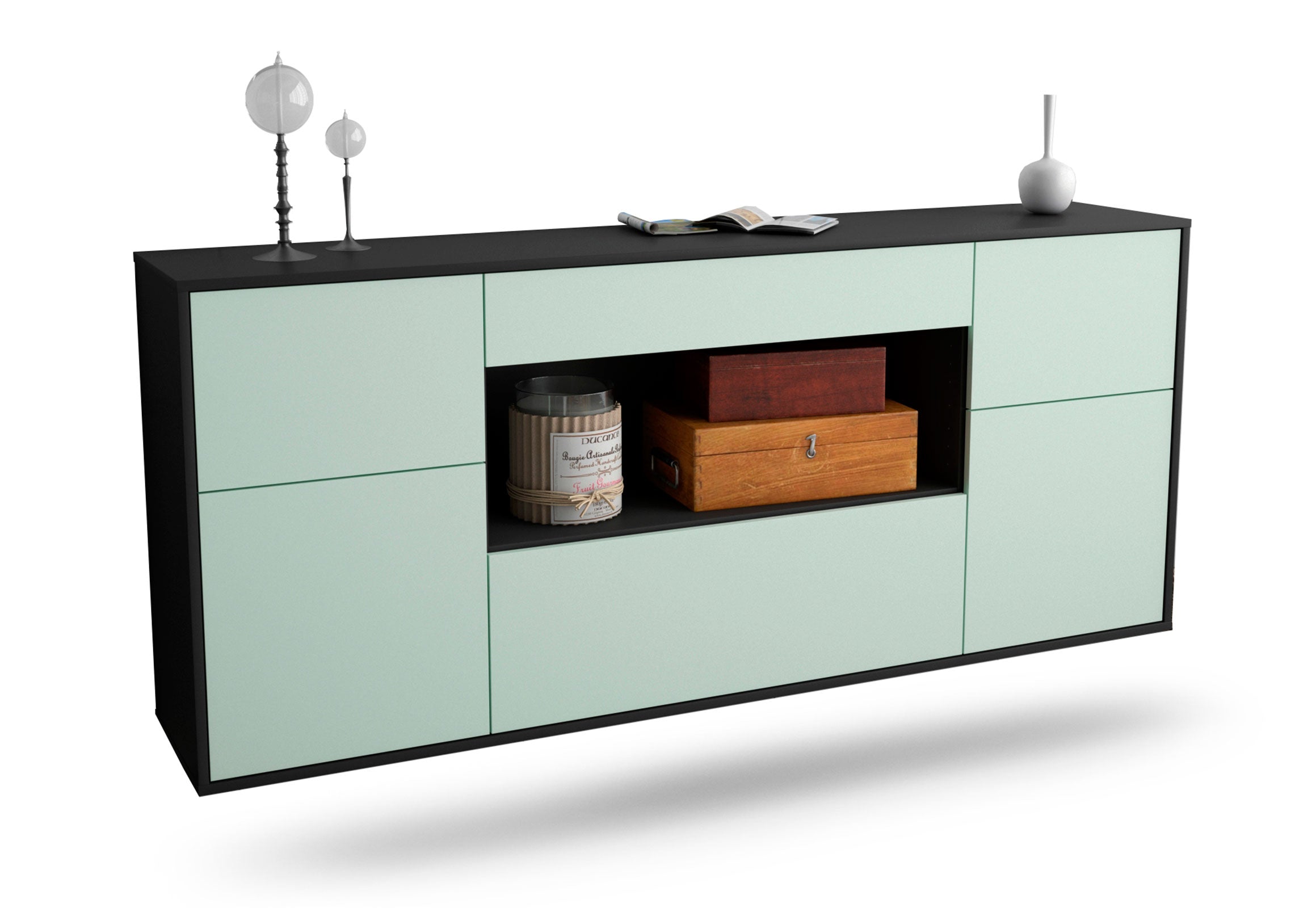 Dieses Sideboard hat Gesamt-Maße von 180x79x35cm. Viel Platz, eine leere Wand, kein passendes Möbelstück? Unsere 1,80 m lange Kommode ist die perfekte Lösung! Die Frontfarbe Eisblau verleiht Ihrem Raum Frische. Das Himmelblau fördert eine sanfte Atmosphäre. Die Farben Hellblau und Mint werden gerne für moderne Wohnräume verwendet. Der anthrazit-matte Korpus harmoniert mit allen Farben und wirkt besonders edel im Kontrast zu hellen Wänden.