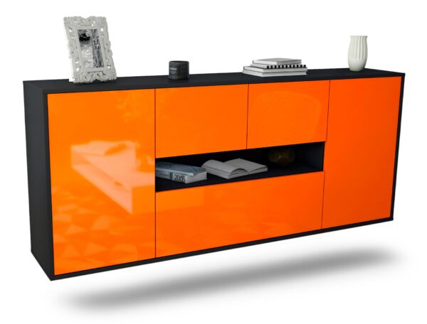 Dieses Sideboard hat Gesamt-Maße von 180x79x35cm. Viel Platz, eine leere Wand, kein passendes Möbelstück? Unsere 1,80 m lange Kommode ist die perfekte Lösung! Die Frontfarbe Hochglanz Mandarine überzeugt durch ein intensives Orange mit tollem Glanz. Fröhlich und gläzend wird diese Farbe jeden Raum für sich einehmen. Der anthrazit-matte Korpus harmoniert mit allen Farben und wirkt besonders edel im Kontrast zu hellen Wänden.