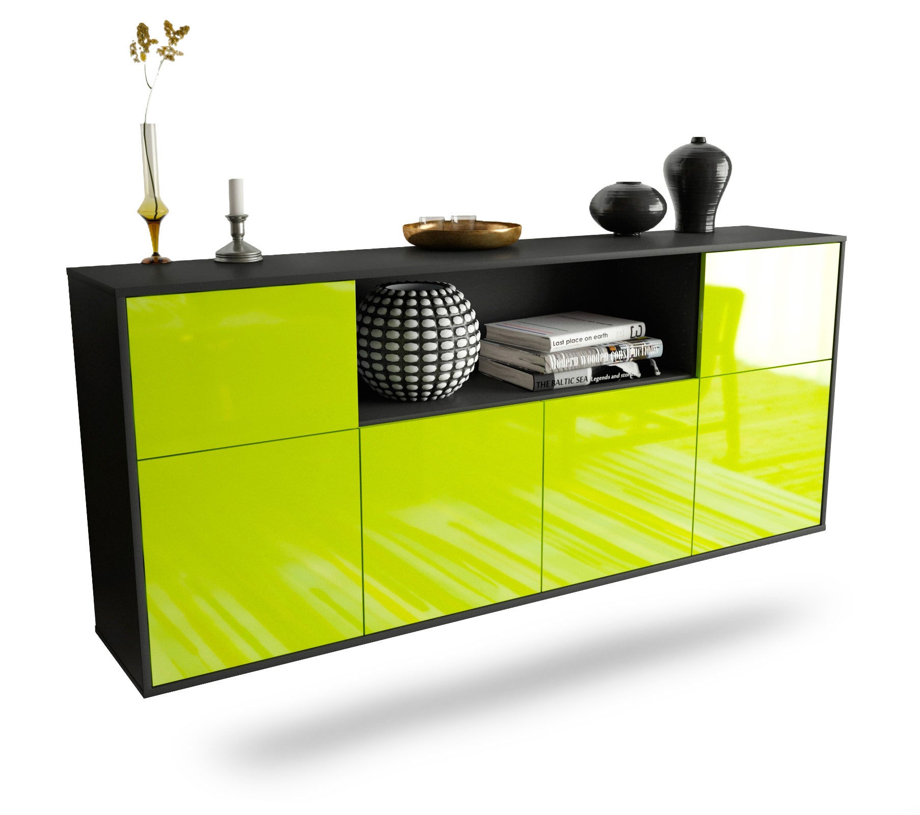 Dieses Sideboard hat Gesamt-Maße von 180x79x35cm. Viel Platz, eine leere Wand, kein passendes Möbelstück? Unsere 1,80 m lange Kommode ist die perfekte Lösung! Die Frontfarbe Hochglanz Limettengrün bringt Schwung, Glanz und Farbe in jede Wohnung. Das knallig, leuchtende grün ist glänzend und wirkt wie ein frisches Apfelgrün oder eine saftige Limette. Der anthrazit-matte Korpus harmoniert mit allen Farben und wirkt besonders edel im Kontrast zu hellen Wänden.